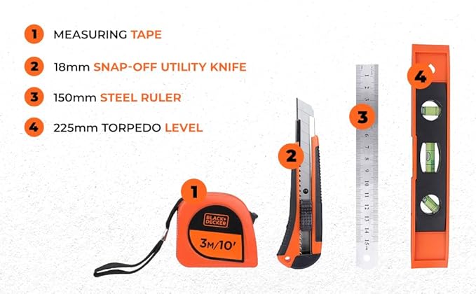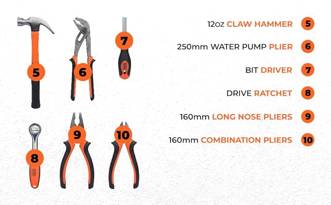 BLACK+DECKER BMT154C Hand Tool Kit for Home & DIY Use (154-Piece) – Includes Screwdriver, Wrench, Ratchet, Utility Knife, Saw, Claw Hammer, Measuring Tape and Plier, 6 Month Warranty, ORANGE & BLACK